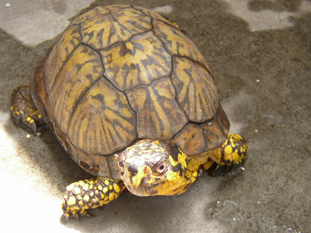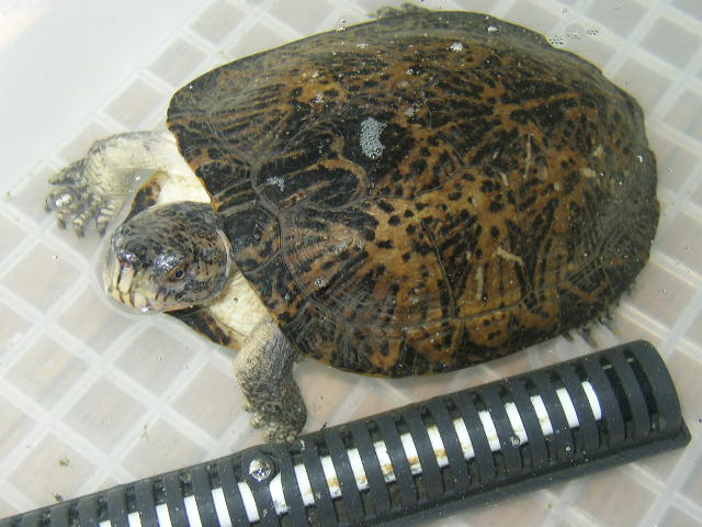 2003年撮影。記憶の上では、確か2002年に飼い始めた。テネシーと明らかに異なる、背甲が黒く濁って斑紋が目立たない、6cm程度に育った若い個体が、単に『リバークーター』として売られていた。買って育ててみたところ、カロライナらしさ溢れる個体になった。