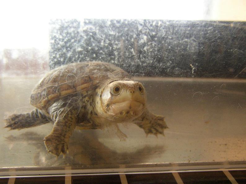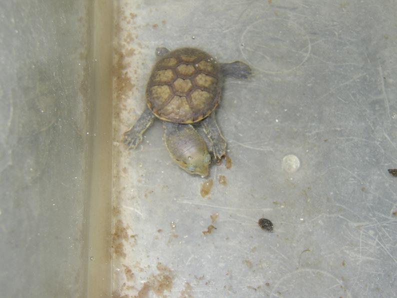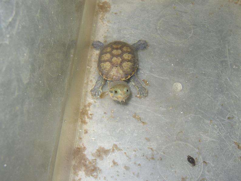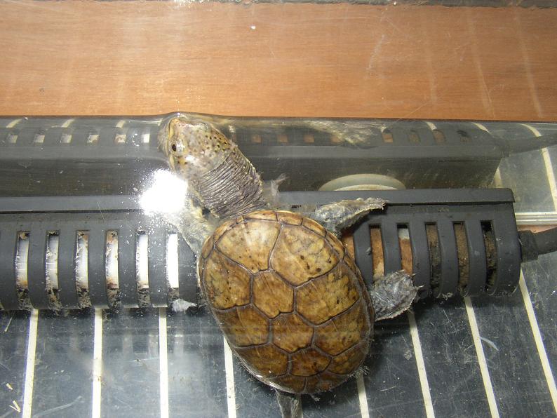 正直、あまりまめな管理はしてない。1日1回(たまに気まぐれで2回)の餌やりと水換え。それでも今日計測したら4.2cmになってた。甲羅はまだかなり柔らかい。ここのところ少し涼しくなったので、ケースをピタリ適温の上に載せている。
