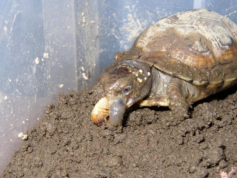 冬眠明けの加温飼育で一気に8cm到達。餌の選り好みが減ったのは大きい。背甲は黄色1色のイメージがあったが、良く見ると所々にオレンジが混じって、パステル風で美しい。