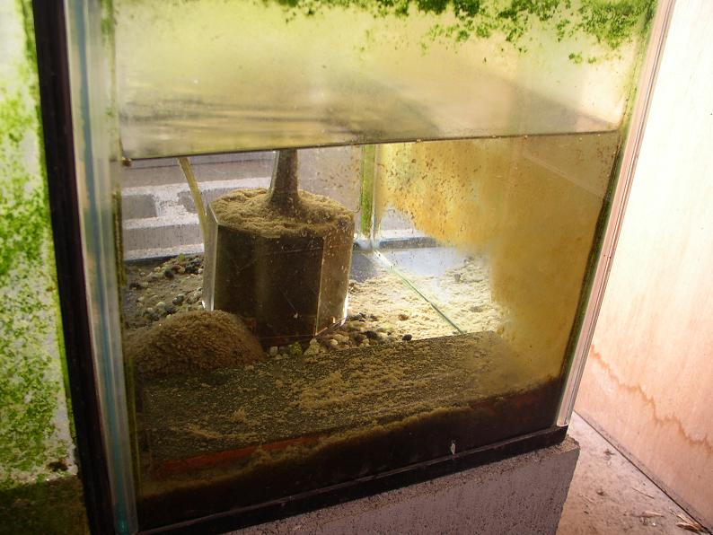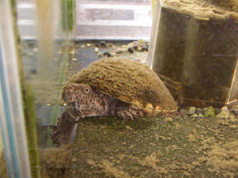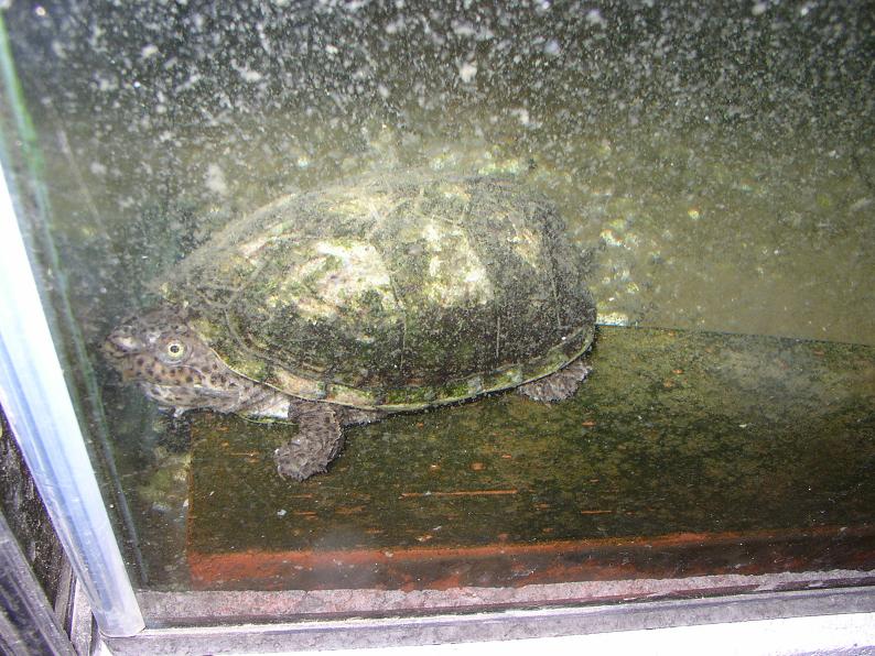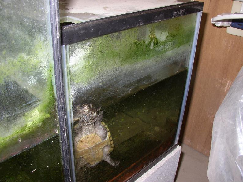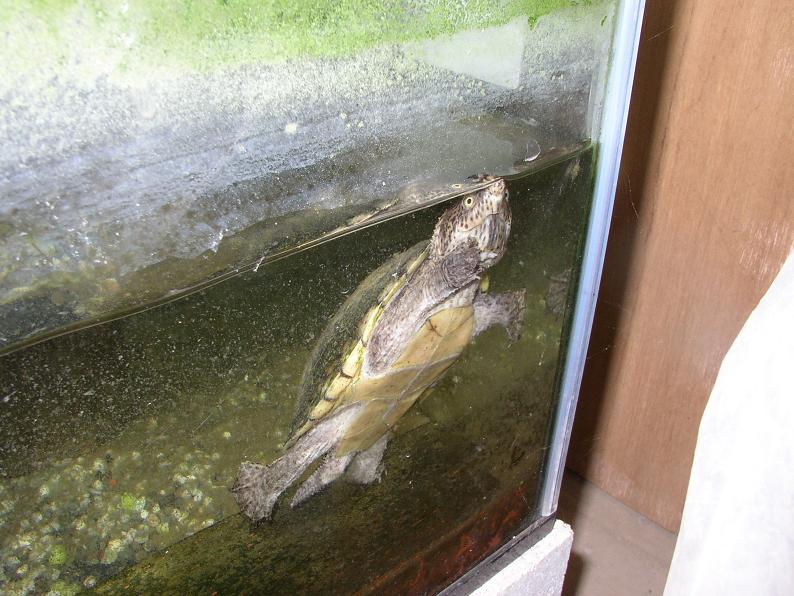 以降は単独飼育。別のメスと同居させたりもしたけど、メスを弱らせてしまってペアリング断念。ここ数年はかなり放置気味で、空気的存在。餌やりも掃除も必要最低限で、餌やりは鯉の餌をせいぜい週に1回(2~3週間くらい忘れる事もザラ)、水は年に2~3回くらいしか換えてない。窓越しの光による水の緑化が効いていると思われる。水作エイトを入れてはあるが、濾材の掃除はもう何年もやってない。こんな飼い方でも元気だし、毎年冬を越している。夏は集中的に給餌するので、画像からも見て取れる通り、流石に汚れが積もって来た。近い内に2/3くらい水換えしようと思う。ちなみに、紫外線はベビーの頃に蛍光灯で少し当てただけで、2001年頃から全く当てていない。カブトニオイも同様に10年くらい飼った。当てないよりは当てた方がいいのだろうけど、個人的にはニオイガメ属に紫外線は要らないと思う。
