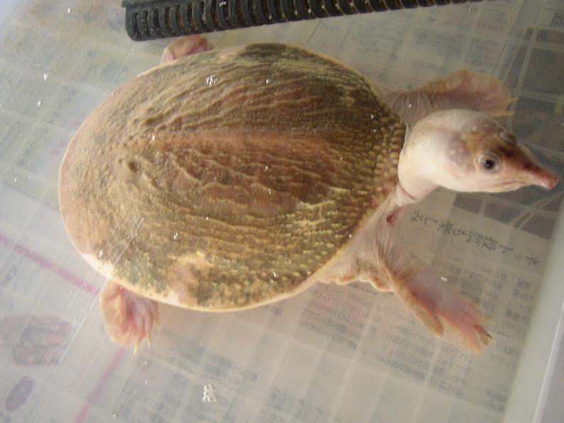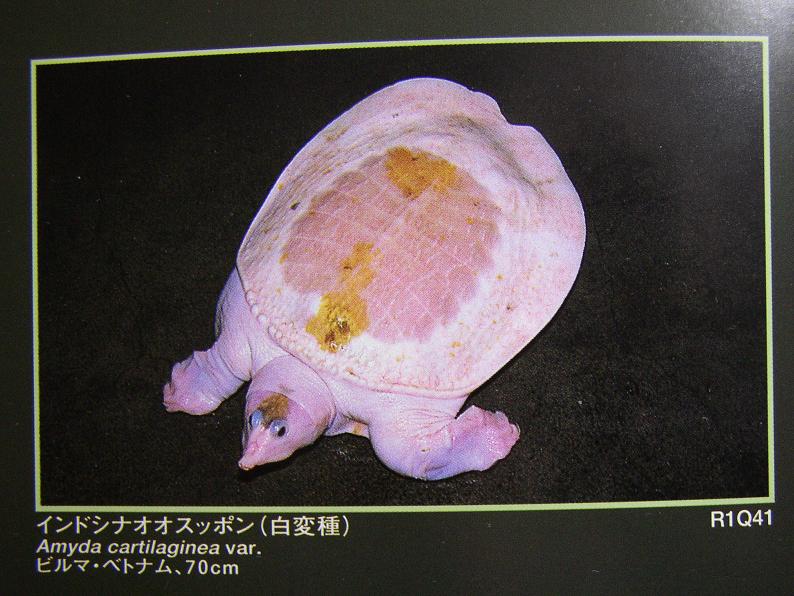 昔、アルビノの本に出てた白変個体。こんなに真っ白な個体でも、頭頂部と背甲の一部には色素が残ってしまっている。海外サイト(※)でこれに近い感じの真っ白い個体の画像があるけど、やはり頭頂部は黒ずんでいる。アンディランドの白スッポン様も少なからず黒ずんでるし。全身純白個体の作出は難しそうだ。これがヘビだと、色素を消す為にブリーダーが躍起になるんだろうけど、本種でそこまでやる人は流石にいないだろう・・・。