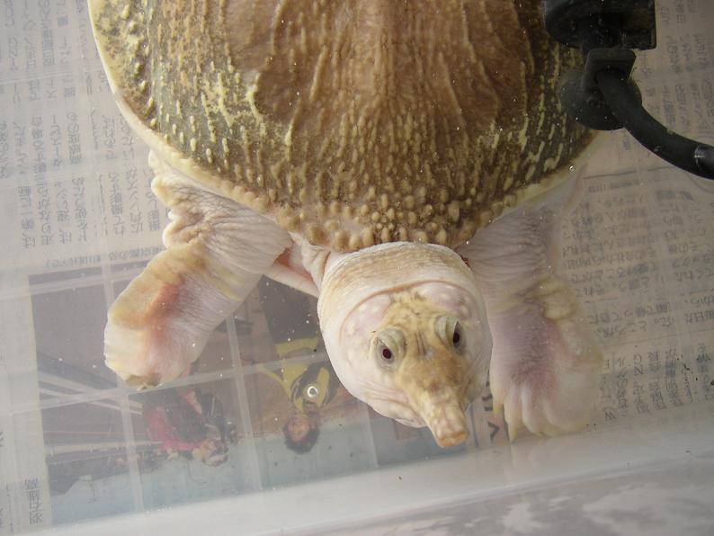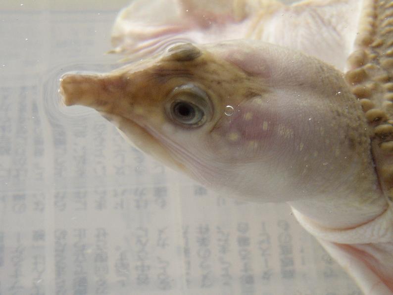 こいつと同時期に輸入されたベビーは現在、いわゆるアルビノらしい、黄色味の強い個体に育ってる(アルビノアカミミみたいな色彩)。こいつと同腹なのか気になる。色彩だけ見ると同腹とは思えないけど、現地での種親も限られてるだろうし。
