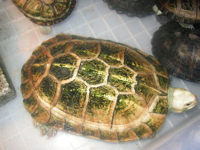 狭い衣装ケースにもかかわらず餌をバンバン食べ、甲長は現在20cm超。夏場以外は餌を控え気味にしてるが、まだ伸びそうな感じがする。亜種が判れば相方を導入したいけど、あまり繁殖繁殖言いたくない。基本は長期飼育で、繁殖はその延長線上でいいと思ってる。まあ、未だにカメを繁殖させた試しがない事への言い訳でもある。