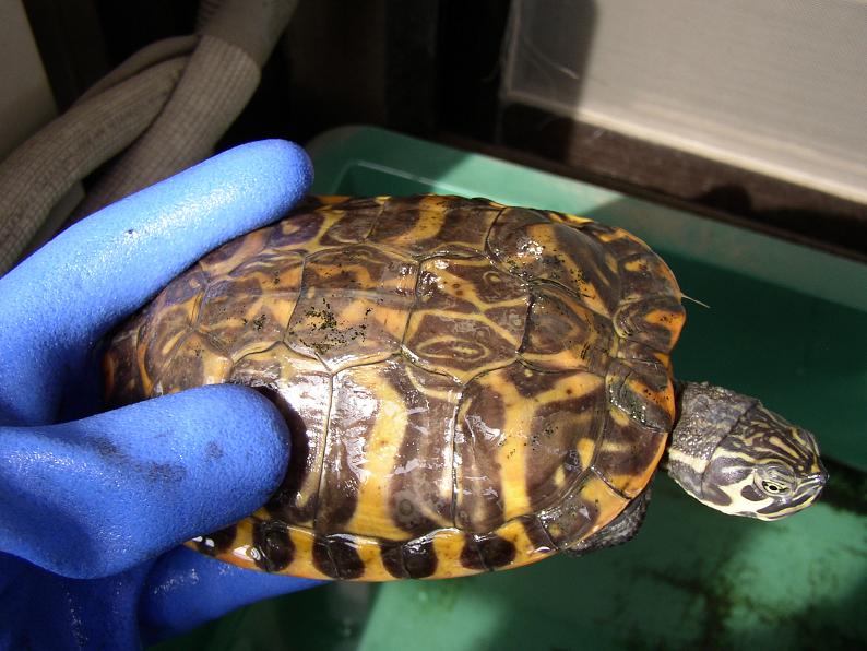 タイプはテネシー由来だろう。かつてミズーリクーターP.c.metteriとされたタイプに、このように背甲の斑紋が太い個体が見られるようで、愛好家視点で言えばそちらの由来かな?テネシー自体は良く見かけるものの、個人的にテネシー亜種を飼うのは、何気に初めてだ(カロライナは昔飼った事がある)。メスっぽいので、まだまだ大きくなるはず。
