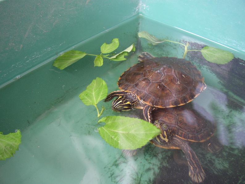 この2匹は選り好みも少なく、特に甲羅が強くくすんでる方の個体はアカミミガメかと思うほど食欲旺盛。購入時にはもう1匹より一回り小さかったが、気付けばほぼ同サイズに。