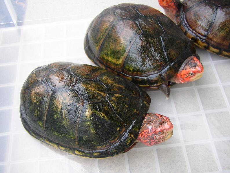 12cmオス、11.5cmメス、10cmメス。購入時より1回り大きくなり、性差が明確になって来た。オスは頭部が大きく、模様は細かく、前肢は太く、甲は細長い。メスは頭部は小さ目、甲は丸みを帯び、前肢は細い。ホオアカで顔の赤味がべったりと乗る個体はメスの可能性が高い(というか、このメス達のレベルでべったりと赤いオスは個人的に見た事がない)。このオスは購入時から右眼が白く濁っていて、昨冬冷やした時にはかなり白くなったが、暖かくなるにつれて多少マシになった。とりあえず生存に問題はなさそう。