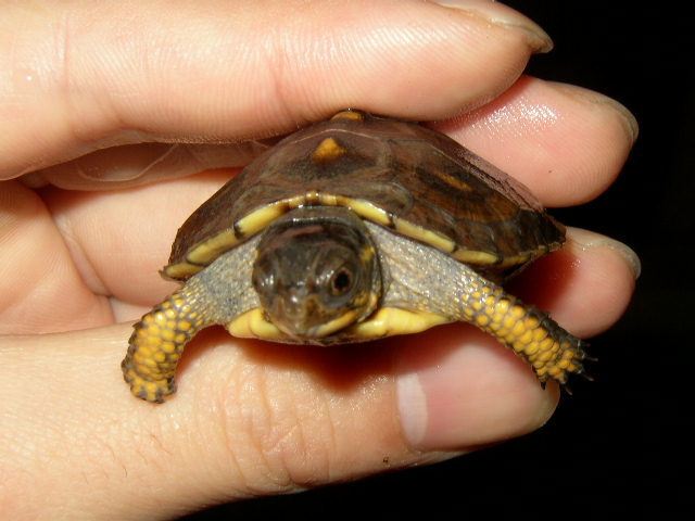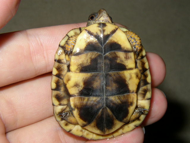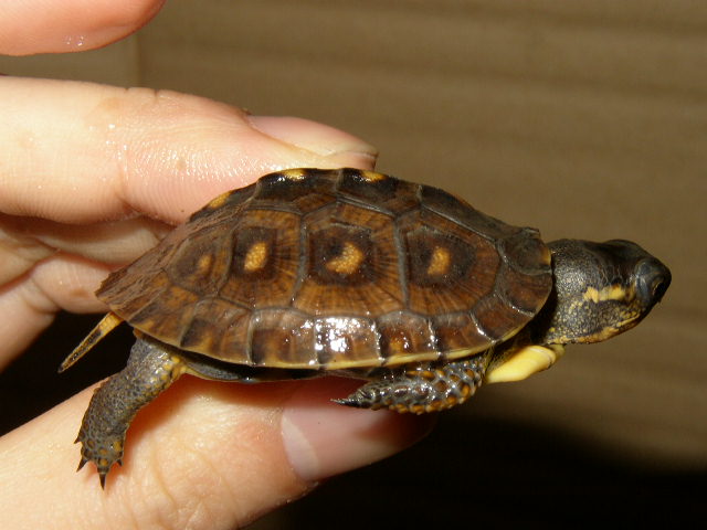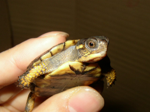 ↑08年12月撮影。購入間もない頃で、4.5cmくらい。前肢の発色が凄い。黄色というより山吹色。派手なトウブといえど、ベビーの内は地味なものとそれまで思い込んでたが、覆された。肋甲板が左右非対称なのは家に到着してから気付いた。出品画像を見返してもしっかり写ってるし・・・。けど、そんなのどうでもいいくらいの、前肢の発色。生餌しか与えてなかったそうだが、うちに来てからすぐに配合飼料も食べ、選り好みしない優等生だった。