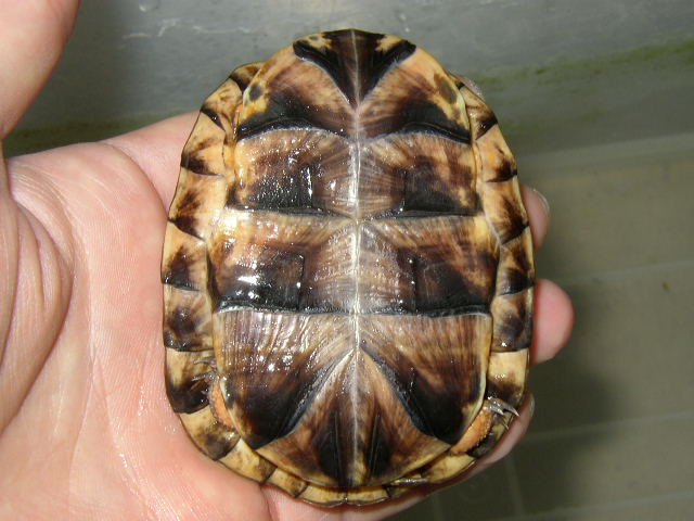 ↑今年7月撮影。夏場以降、室内で何の光源もなしに管理してたが、意外なほど歪まずに育ってくれた。甲板の新しく伸びた部分がやけに淡いのは、無光源飼育の影響だと思う。右の画像で日光浴させてるように思われそうだが、撮影の為に出しただけ。室内の薄暗い場所に置いたケースで、餌をあげて水を換えるだけの毎日。とりあえず、1日1~2回は甲羅全体を濡らしていた。お陰で水道水のカルキ?の沈着が酷いが、成長線が伸びてる時は怖くて擦れない。