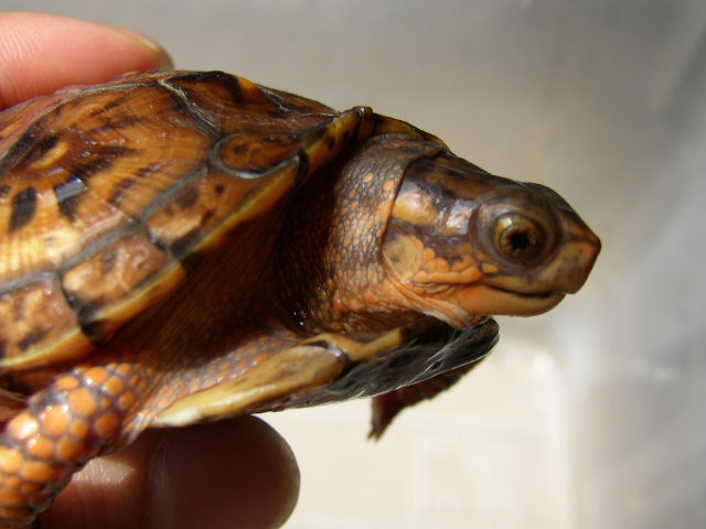 ↑今年5月撮影。5cmを越える頃からどんどん地色が明るくなった。肌の色味も、山吹色から一気にオレンジへと変化。屋外で撮影した左の画像が肉眼に近い。この頃は管理をサボりがちで、甲羅に付着したヌルヌルをもっとこまめに落としてやれば良かった。また、実は購入してから今年9月まで太陽光に殆ど当てていない(室内でレプティサン5.0のみ)。これも後悔している。