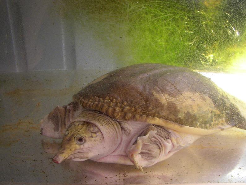 取扱業の更新絡みで視察に来た保健所の人が一番びっくりしていたのはインドシナオオスッポン。まあ、我が家のカメの大半は20cm足らずだし、他の水槽はアオコで中が見えなかったりするから、水槽の横から見えるこの個体は目に付くと思う。