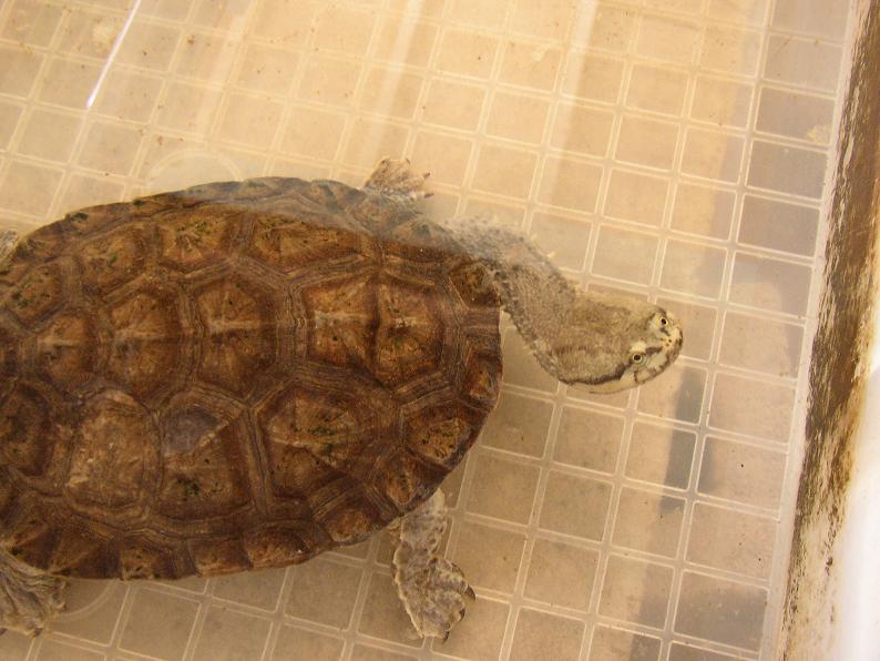 あと、やたら皮膚が剥ける。水換えする頃には剥けた皮だらけ。皮膚の状態が悪いようには見えないので、これで正常なのだろうか。ハコヨコクビの雑居水槽でも割と皮は浮いてるので、曲頸類では一般的なのかしら。曲頸類の飼育経験が少ないので良く判りません。