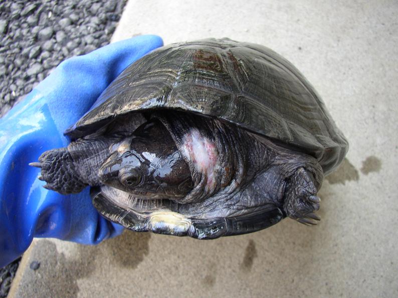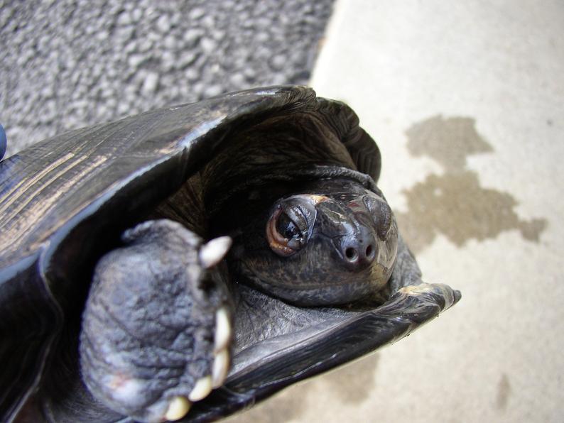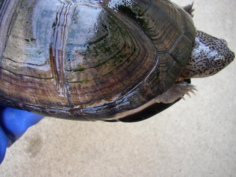 当初、こいつも他の4匹と一緒にしていたが、御覧の通り甲の一部を噛まれてしまったので隔離。こいつは以前に単独飼育にもかかわらず謎の肌荒れを起こしたり(http://blueorange.sugo-roku.com/Entry/150/)、一昨年は真冬でも土に潜らないので加温飼育に切り替えたり、妙に弱い印象がある。単独飼育している分には普通に元気なのだが・・・。この地味さでは繁殖に積極的に使う気にもなれないし、ペットと割り切って飼って行くしかなさそう。