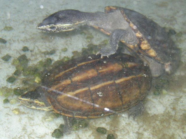 こちらは別水槽で飼育中のペア。2006年4月より飼育。こちらのメスは未だ産卵すらしていない。窓際に設置している為、冬に寒過ぎるのかもしれない。オスはかなり荒い個体で、これまでにメスを2匹殺している。以前こいつに指を噛まれたが、思いのほか痛かった。手に持つ時はフロリダドロガメ並に気を遣う。ちなみに、このオスも派手に甲羅が欠けている。我が家には何故か甲欠けの、しかしながらやる気はあるオスが巡って来る。