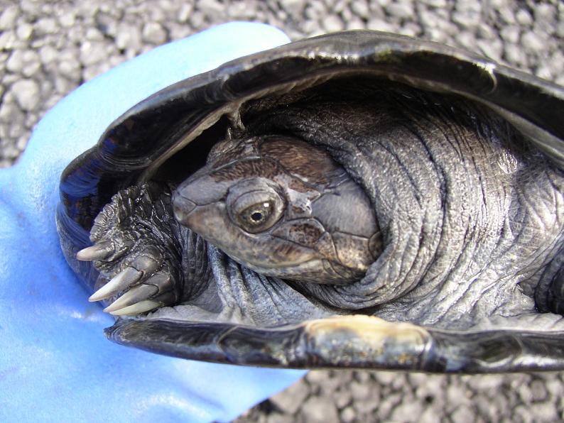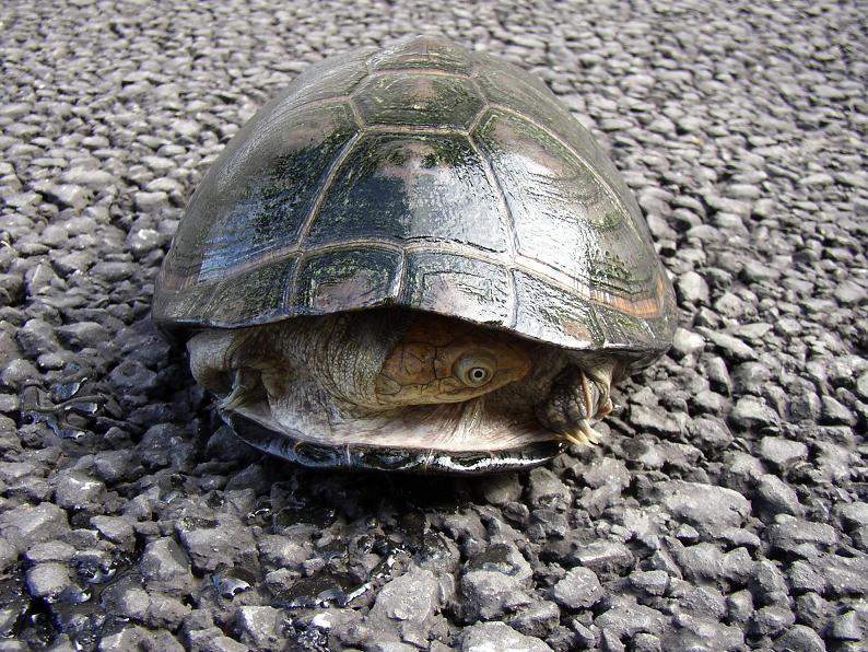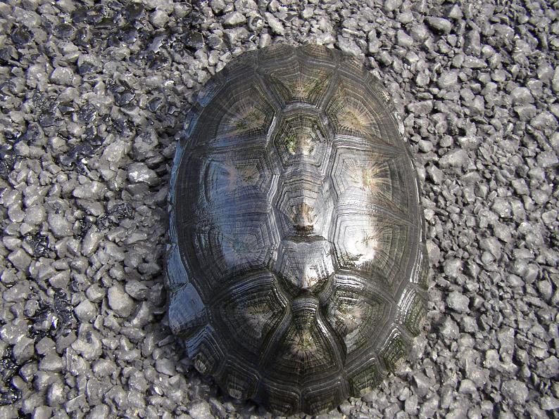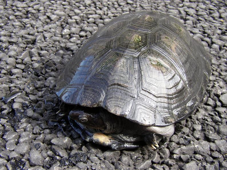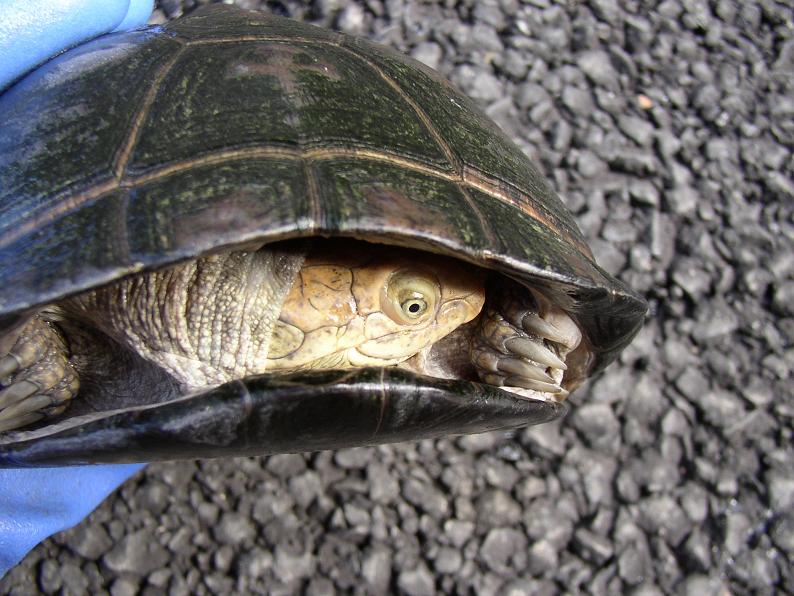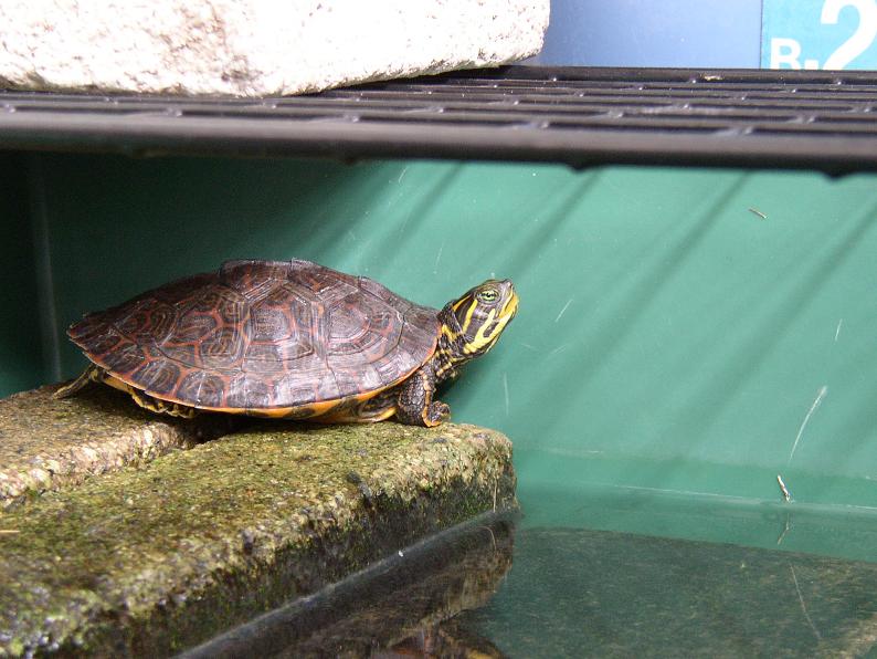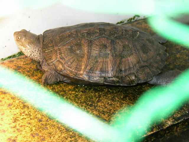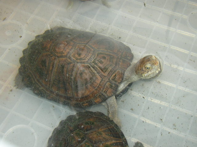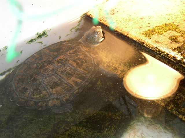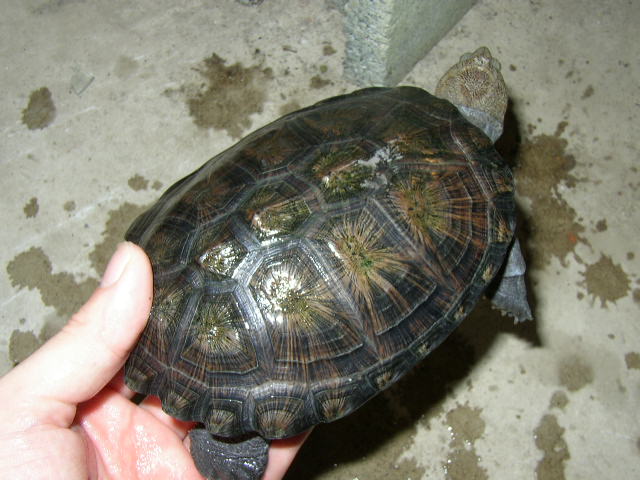 2003年撮影。記憶の上では、確か2002年に飼い始めた。テネシーと明らかに異なる、背甲が黒く濁って斑紋が目立たない、6cm程度に育った若い個体が、単に『リバークーター』として売られていた。買って育ててみたところ、カロライナらしさ溢れる個体になった。