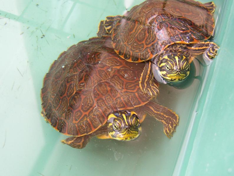 メスは甲羅が真っ黄色(飼い主の怠惰で苔だらけだが)、頭頂部にスポット模様が密に入る個体。オスは皮膚がパステル調で、一風変わった雰囲気。甲羅に目立 つ欠けがあるものの、涼しい季節(春、秋)に良くメスに乗っかる、”やる気のある”オス。実は購入当初、もう1匹別のオスとトリオで購入したのだが、そちらのオスにはやる気が見られない為、手放してしまった。甲欠けはあっても、やる気のあるオスの方を残して、結果的に繁殖に至った。