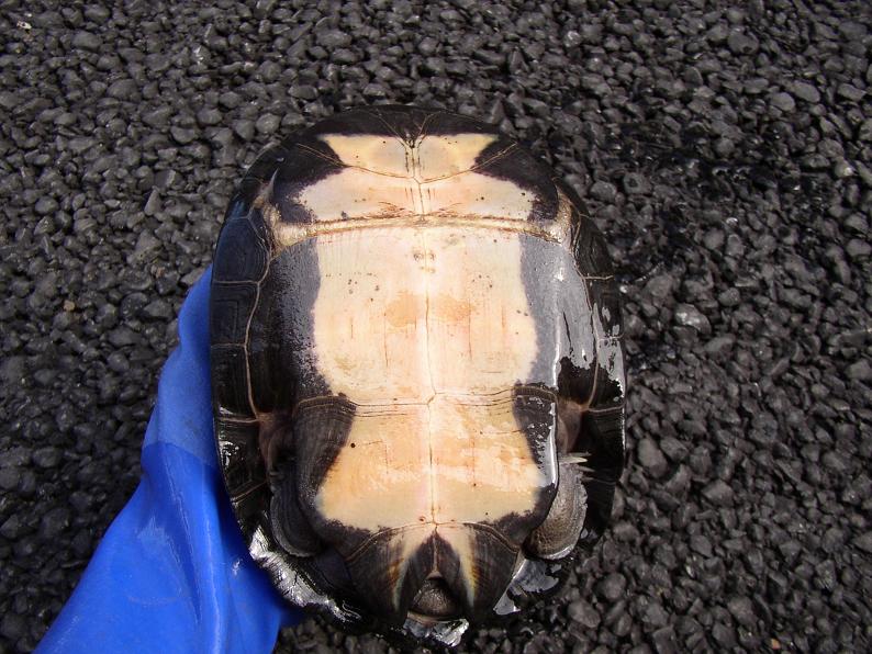 チズガメやテラピンに多いが、こいつも甲羅がだいぶガサついて見苦しかった。それと直接関係あるかどうかは不明だが、冬眠明けの03年春先に餌を食べなくなった。愛好家の助言で、背甲全体にテラマイシンを塗りたくって数日間管理したところ(左の写真)、普通に餌を食べるようになった。その後は順調に見えたのだが・・・