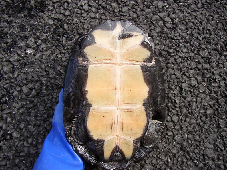 近影。衣装ケースに詰め込んでる頃はオスにもかかわらずクロヤマガメに乗っかられて大変そうだったが、昨秋120cm水槽に移してから本領発揮。だいぶ立派になって来た。餌は配合飼料主体に、たまに肉や甲殻類。一時、飼主の手抜きで配合飼料に頼りっ放しだったせいか、或いはCBだからか、甲の厚みはWCには及ばない。