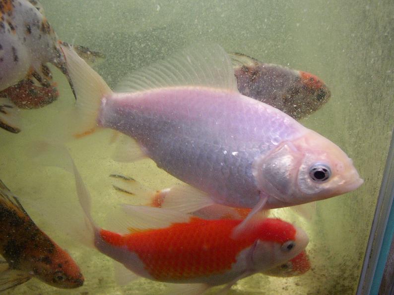 真っ白な三尾和金。実はこいつ、購入当初は更紗だった。水温が高いと緋が飛び易いと言われるけど、恐らくそれに当てはまってしまったんだろう・・・。