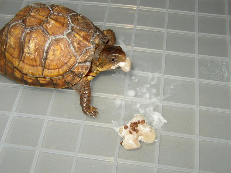 何時の間にかチョビ少年も花の大学生になったけど、相変わらずこの趣味は続けていた。ある日訪れた観賞魚店。5~6cmくらいに育ったキバラガメが数匹売られていた。(おっ、キバラだ。売れ残って大きくなってんな。爬虫類専門店じゃないから売れないのかな。まあ、これもどうせオス・・・あれ?何だか尾が細くない?え?ま、まさか、メスですか!?うそ~ん!!!)