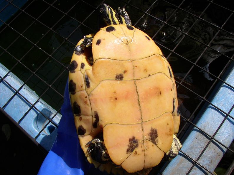 手に取って見せて貰う。何度見ても、明らかに尾が細い。100%断言はできないものの、99%メスっぽい。それまでオスばかり飽きるほど見て来たんで、違いは一目瞭然だった。震えた。買った。遂に念願のキバラメスを手に入れた。こんなに遠回りしないで買えた人も中にはいるんだろうけど、自分の場合は本当に苦労した。ヒグチで初めて見てから実に6年。自分ほどキバラガメのメスを欲しがった人も、そしてその入手に苦労した人も、そうはいないと思う。捨てられて野生化すらしている昨今では、共感して貰うのはちょっと難しいかな。