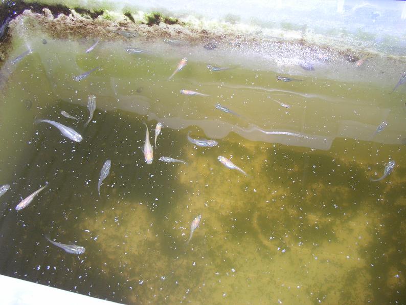 メダカは餌じゃなく、鑑賞用。母が知り合いから貰って来たものなので、餌にする訳には行かない。何処からともなく沸いて来る巻貝はハラガケの良い餌。