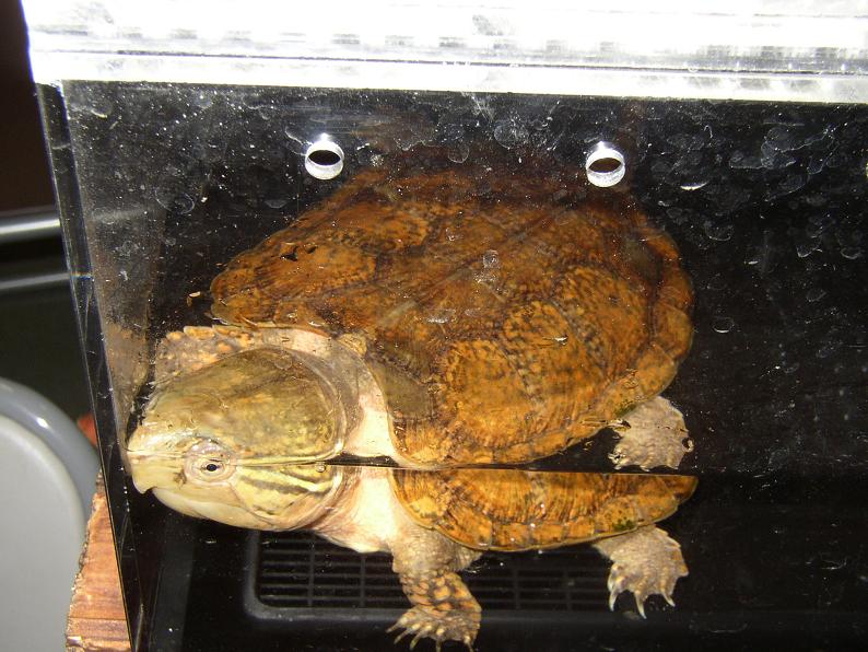 もはや書くネタがなくなりつつあるインドシナオオスッポン。何時も実物より綺麗に写ってしまうので、実際の体色を紹介。左フラッシュ有り、右フラッシュなし。