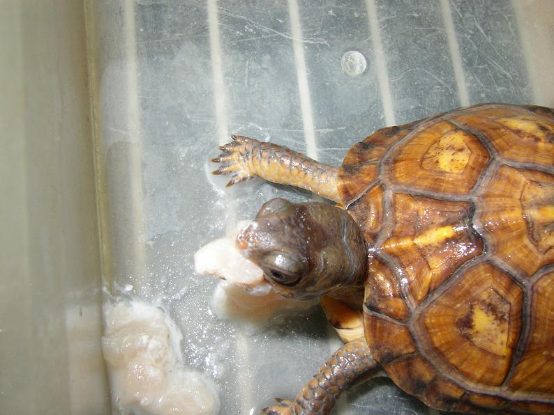 アメハコベビーは配合主体でも育つには育つけど、09CBを育てるにあたっては生餌を多用し、サプリメントの添加を心掛けた結果、08CB達より良い甲羅に育ったように感じている。ケースの水を抜いて食べさせると汚すし、洗うのも面倒だけど、効果が見て取れるから飼主も頑張れる。