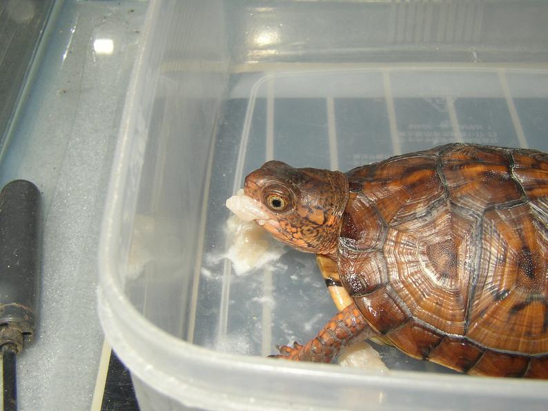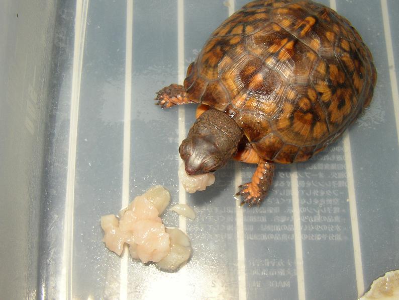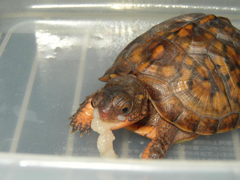 流石に丈夫な種で、すくすくと成長し、見ていて楽しかった。甲羅の模様が消えて黒くなっちゃったのはガッカリしたけど。最初の冬は加温飼育し、その後はベランダで通年無加温飼育。ずっと元気にしてたけど、8年後の春、冬眠明けに体調を崩して死んでしまった。8年に渡って餌は配合飼料と乾燥エビが主体で、植物質の餌は全くと言っていいほど与えてなかった。今思うと、そんな食生活が長年続いて、個体の健康を阻害してたのかもしれない(死亡との直接の因果関係は不明だけど)。サイズが約13cmから伸び悩んでたのも、その辺りに一因があった?