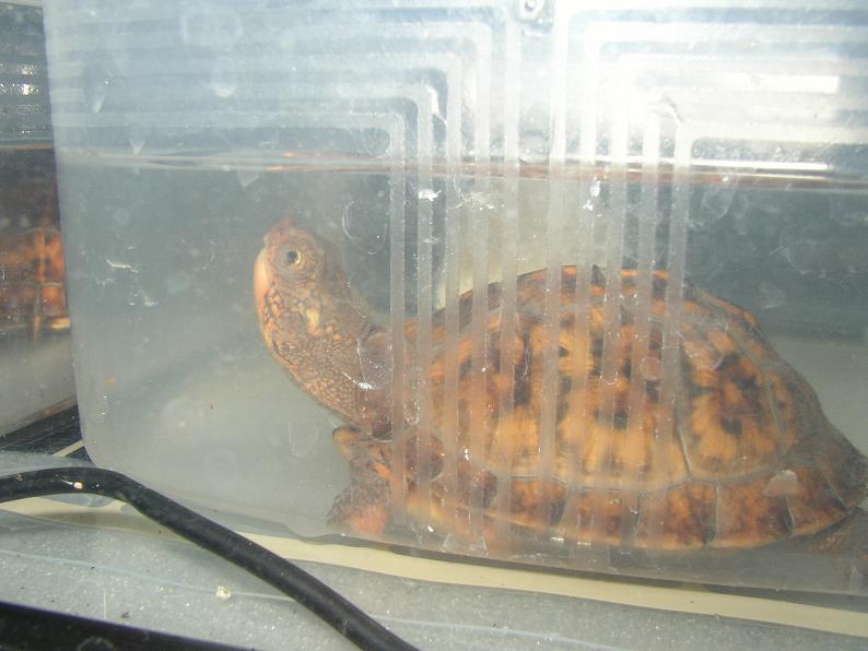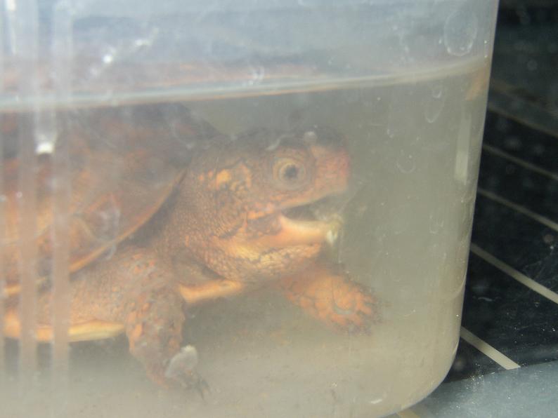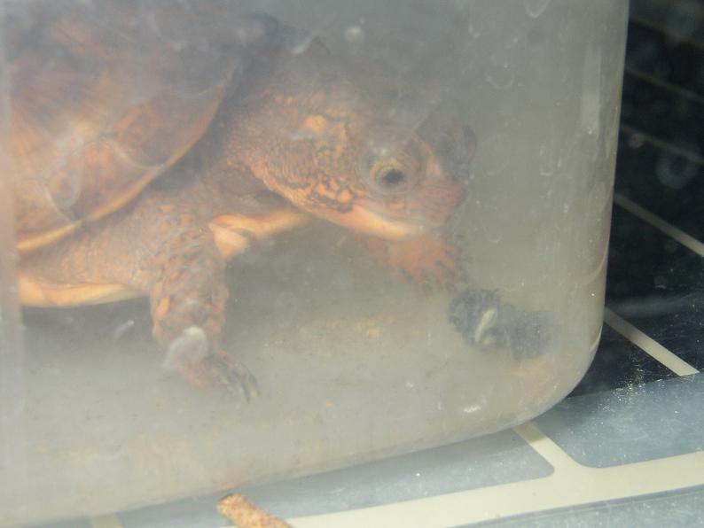 日光浴させた時にふと腹甲を見たら、御覧の通り。ショック。何時の間にこんな状態に?最近、少し観察を怠ってたかもしれない。濡れてると判り辛い事もあって、こんなになるまで気付けなかった。日光浴させても、4号は腹を床に付けておとなしくしてる事が多いので、そこだけ湿度が残って、しっかり乾燥してなかったのかも。何たる不覚・・・。
