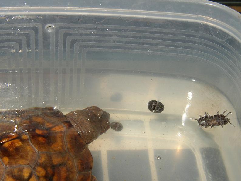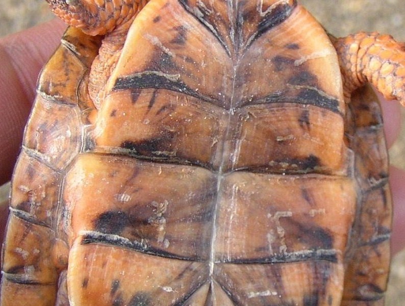ちなみに2号の腹甲は平気。真ん中辺りが白っぽいけど、これは擦れば落ちる。2号は日光浴中もせわしなく歩き回るので、4号よりもまんべんなく体が乾燥する。今にして思えば、そのお陰で雑菌の繁殖が抑えられていたのかも。けど、背甲の方は既にもう・・・。