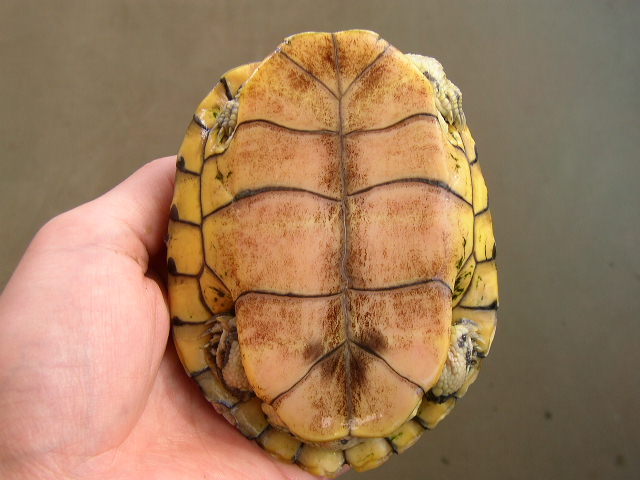 ↑09年10月。ふと気付いた。これまで1回も脱皮させてないじゃん!大きくなる訳がない。何となく飼い続ける日々の中で、客観性をすっかり失っていた。太陽光に当てれば多少解消されるかと思い、09年夏から初めてベランダに出した。室内飼育に慣れ過ぎた為か、餌を殆ど食べない。それでも太陽光の影響は絶大で、10月に初めて甲板が剥けた(剥いた)。しかし、剥いたその下の甲板も古そうに見える。数年分の古い甲板が蓄積されてるんだと思う。無理に剥がす訳にも行かないので、時間をかけて直して行きたい。