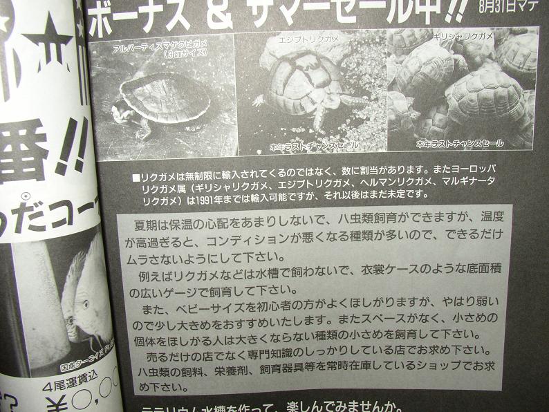 当時はまだ、今では考えられないくらい高値で、ごく一部のマニア向けという印象だった。グレード的には現在と比べてもさほど見劣りはしない感じ。改めてこの2ページだけを見ると、20年も前とは思えない。現在でも決してポピュラーとは言えない現状を考えると、やっぱりカメの品種固定化は大変なんだろうと思う。ヘビやヤモリを取り巻くこの20年間を考えると、カメのライフサイクルの長さを感じずにはいられない。カメの飼育は本当に気長に考えないと、簡単に行き詰まりそうだ。