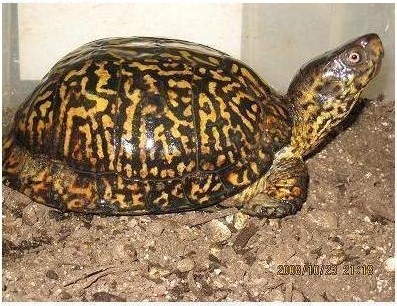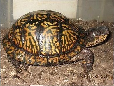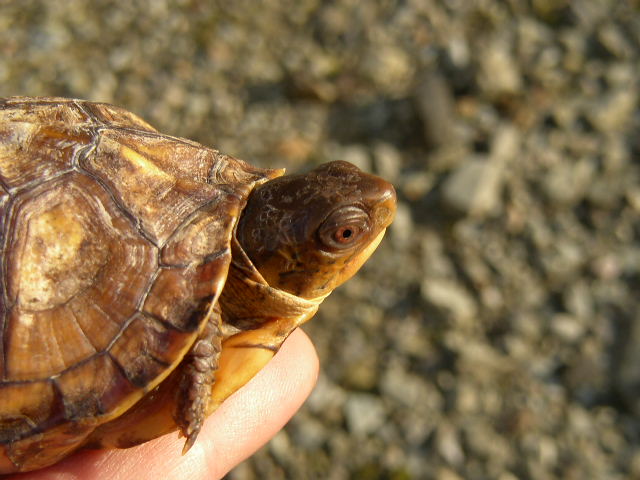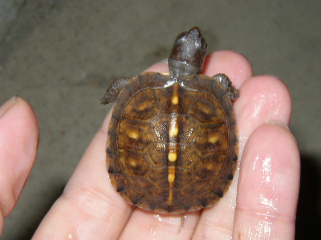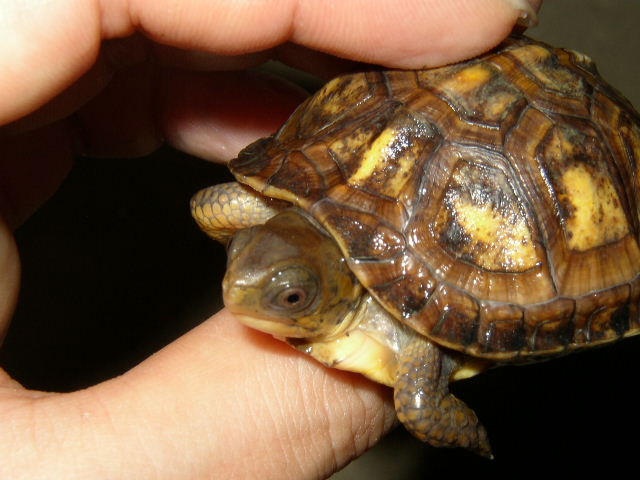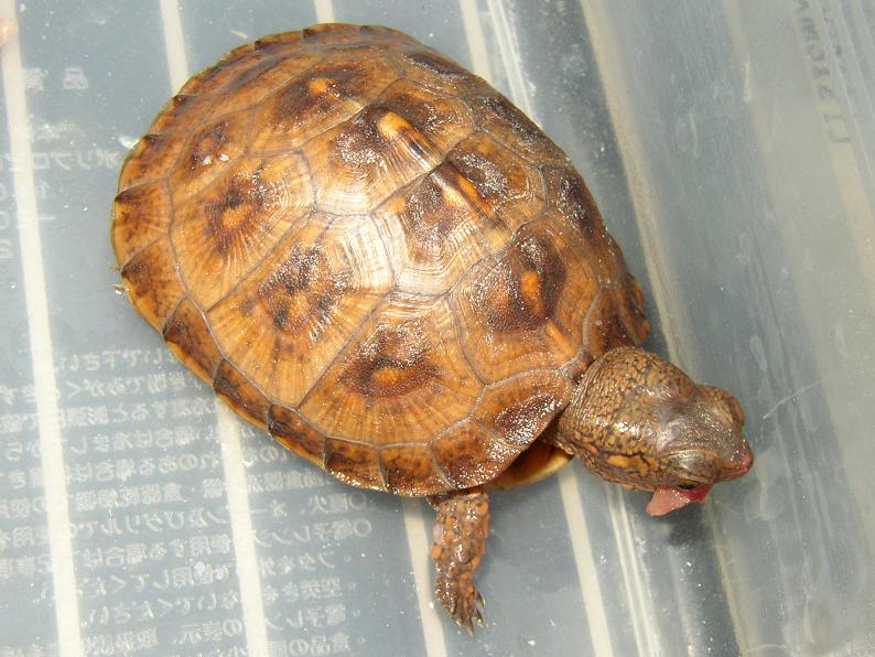 ↑昨年11月撮影。当時約3.6cm。HBM2008で、トウブ他アメハコを多数販売しているブリーダーから購入。この時は自分がまだ模様や色味について理解しておらず、とりあえず甲の厚みを優先して選んだ。でも、今こうして画像を見返してみると、前肢や喉元の色味はかなり有望だったんだな。結果オーライ。餌は配合しか与えていなかったそうだ。