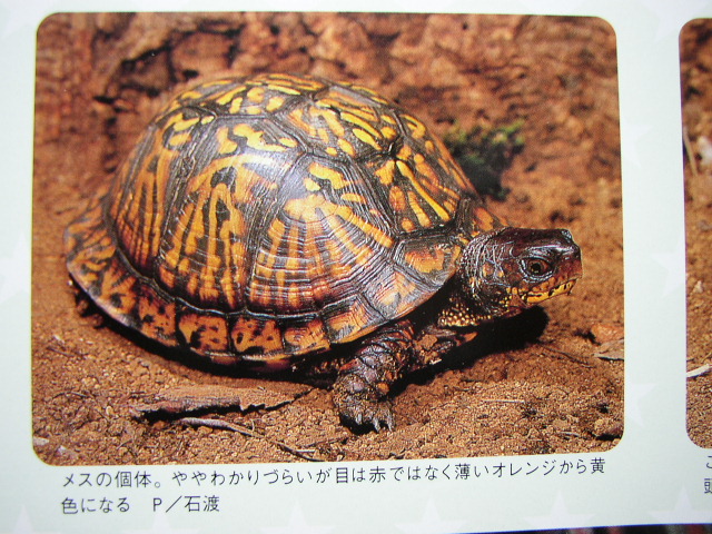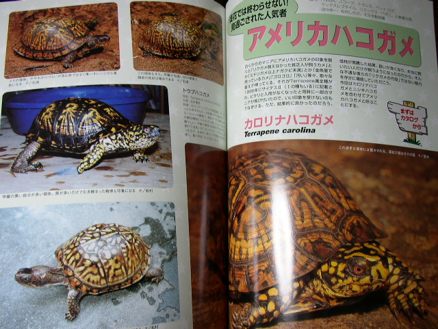 ビバガ初のアメリカハコガメ特集。カラー写真で大きく紹介されてる上の2個体。そう、これがGC血統の両親(なお、当時の所有者は別の方だったそう)。ここ2~3年でカメに興味持った人には信じられないと思うけど、この頃のトウブを取り巻く状況って凄かったんだよ。それこそ『腐ってもトウブ』で、この2ページに載ってるような個体達なんて、店側がまず売らなかった。CBベビーでさえ価格は6桁に近かった。学生が買うなんて無理。当時、この2ページをどれだけ眺めた事か。