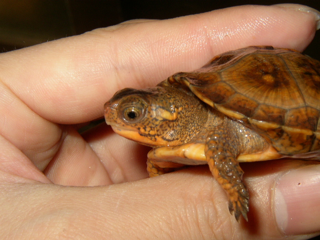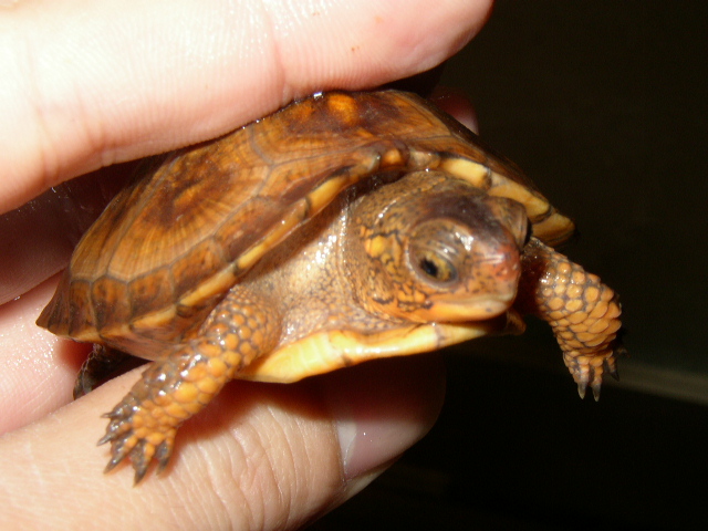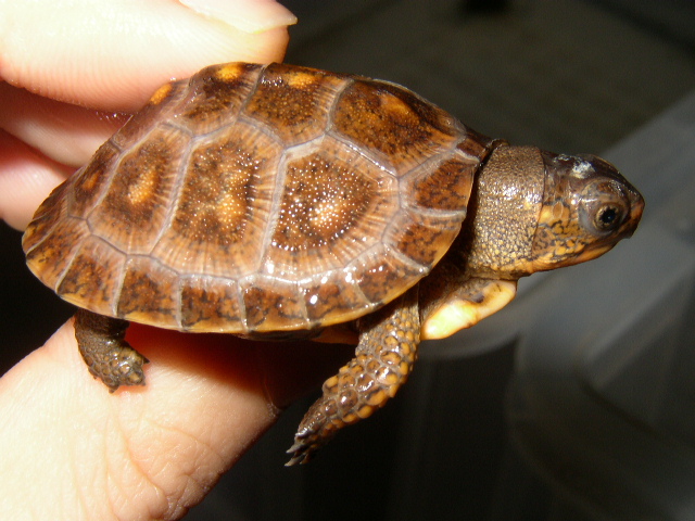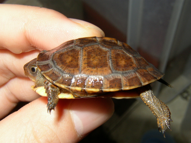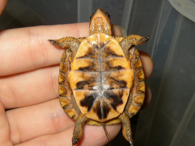 ↑08年12月撮影。購入間もない頃で、4.5cmくらい。前肢の発色が凄い。黄色というより山吹色。派手なトウブといえど、ベビーの内は地味なものとそれまで思い込んでたが、覆された。肋甲板が左右非対称なのは家に到着してから気付いた。出品画像を見返してもしっかり写ってるし・・・。けど、そんなのどうでもいいくらいの、前肢の発色。生餌しか与えてなかったそうだが、うちに来てからすぐに配合飼料も食べ、選り好みしない優等生だった。