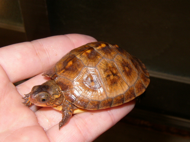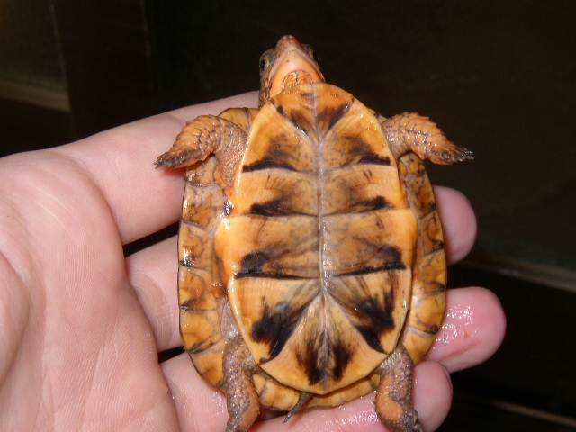 ↑今年5月撮影。5cmを越える頃からどんどん地色が明るくなった。肌の色味も、山吹色から一気にオレンジへと変化。屋外で撮影した左の画像が肉眼に近い。この頃は管理をサボりがちで、甲羅に付着したヌルヌルをもっとこまめに落としてやれば良かった。また、実は購入してから今年9月まで太陽光に殆ど当てていない(室内でレプティサン5.0のみ)。これも後悔している。