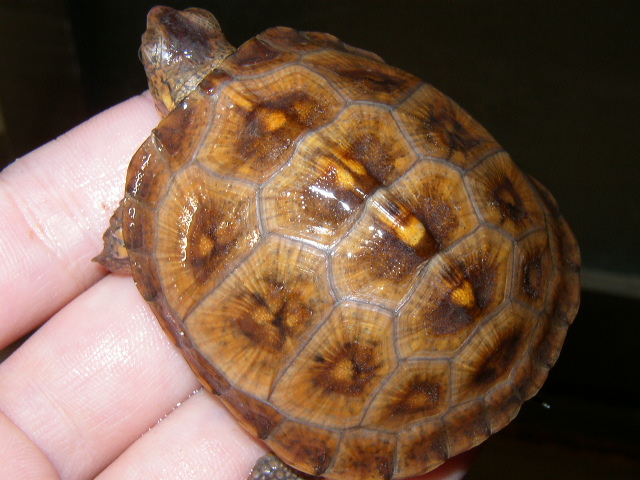 ↑近影。こちらも5.5cmを超えた。甲羅の地色がどんどん明るくなり、肌も派手になって来た。側頭部から喉元にかけての複雑な模様がとても美しい。肋甲板にうっすらと黒斑が浮かんで来たように見える。これからどう化けて行くんだろうか。2号と4号を見る限り、08CBはこの血統の中ではむしろ例外的な色彩パターンだったのかもしれない。08CBは色味こそ派手だが、2号と4号のような複雑な模様はない。