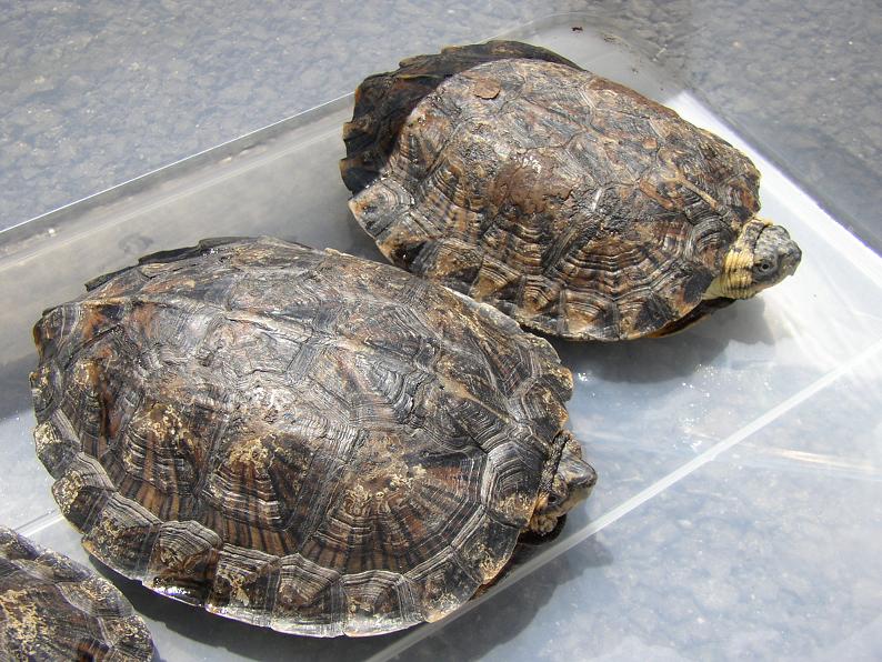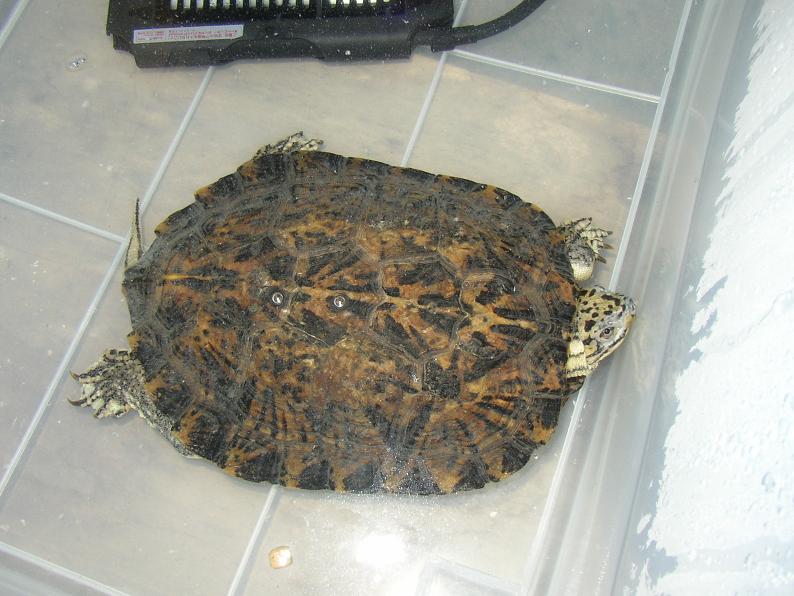 一昨年の東レプで買った個体。購入当初より少し成長した。当初はメスだと思ってたが、尾が若干太く目立つようになり、メスに比べ相対的に甲が薄い(最近ようやく違いが判るようになって来た)。どうやらオスのようだ。基本的に協調性はあるが、マルガメにしては性格も乱暴で、他個体の尾を噛んで短くしてしまった。マルガメはおとなしいからと油断していた飼主のミスだ。しかし、繁殖を狙うならこれくらい荒いオスの方が良いかもしれない。