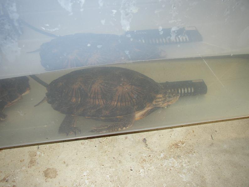 6匹中、とりあえず3匹を衣装ケースで飼育。スペースの関係や個体同士の相性もあり、これ以外の3匹はハコヨコクビ水槽やビルマヤマガメ水槽で雑居させている。雑居水槽の方には陸地とレフ電球があるが、本種が上陸しているところを見た事がない。基本的に水棲傾向が強いようで、日光浴らしい日光浴を好む種類ではなさそうだ。