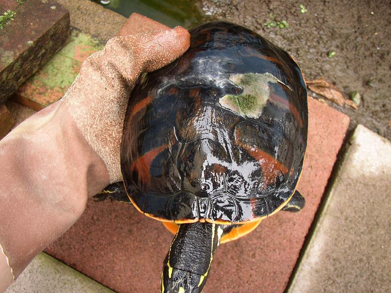 夏に撮影。背甲の一部、丁度剥がれた辺りが変色しているのが判る。見た感じちょっと変だが、脱皮の前触れだろうとタカをくくっていた。この頃には内部でかなり症状が進行してたのね・・・。