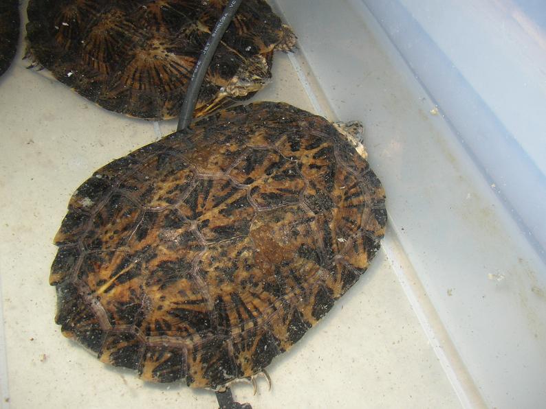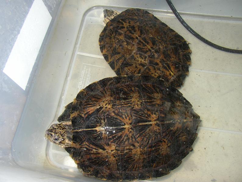 一昨年の東レプで買った個体。購入当初より少し成長した。当初はメスだと思ってたが、尾が若干太く目立つようになり、メスに比べ相対的に甲が薄い(最近ようやく違いが判るようになって来た)。どうやらオスのようだ。基本的に協調性はあるが、マルガメにしては性格も乱暴で、他個体の尾を噛んで短くしてしまった。マルガメはおとなしいからと油断していた飼主のミスだ。しかし、繁殖を狙うならこれくらい荒いオスの方が良いかもしれない。