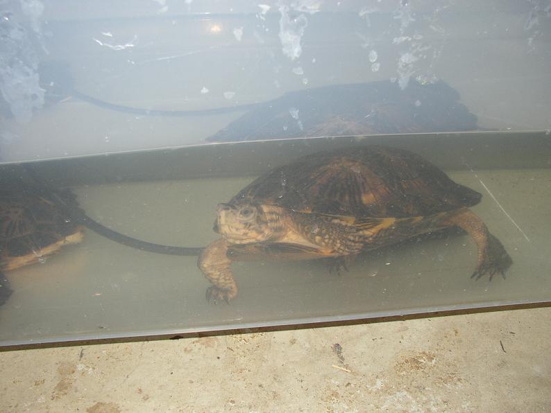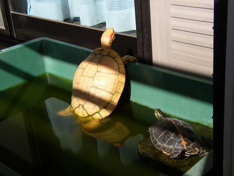 6匹中、とりあえず3匹を衣装ケースで飼育。スペースの関係や個体同士の相性もあり、これ以外の3匹はハコヨコクビ水槽やビルマヤマガメ水槽で雑居させている。雑居水槽の方には陸地とレフ電球があるが、本種が上陸しているところを見た事がない。基本的に水棲傾向が強いようで、日光浴らしい日光浴を好む種類ではなさそうだ。
