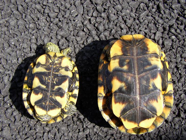 近況については先月書いたばかりで、次はまた忘れた頃にお届けする予定だったが、ふと目に留まった点を1つ。久々に真面目に腹甲を観察したら、何時の間にか雌雄でだいぶ違う雰囲気になってた。メスは典型的な本種の模様だが、オスは模様が薄くなってる。メラニズムを起こすオスの方が濃くなり易いかな?なんて思ってたのだが。