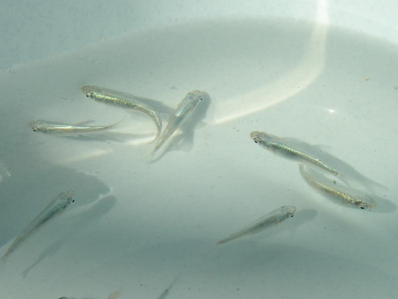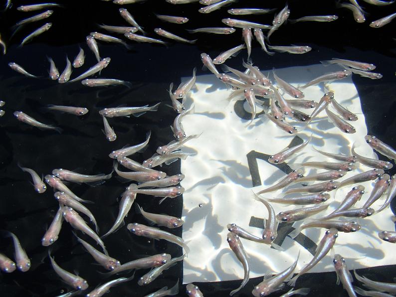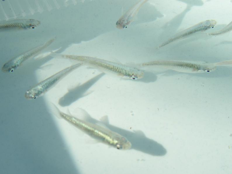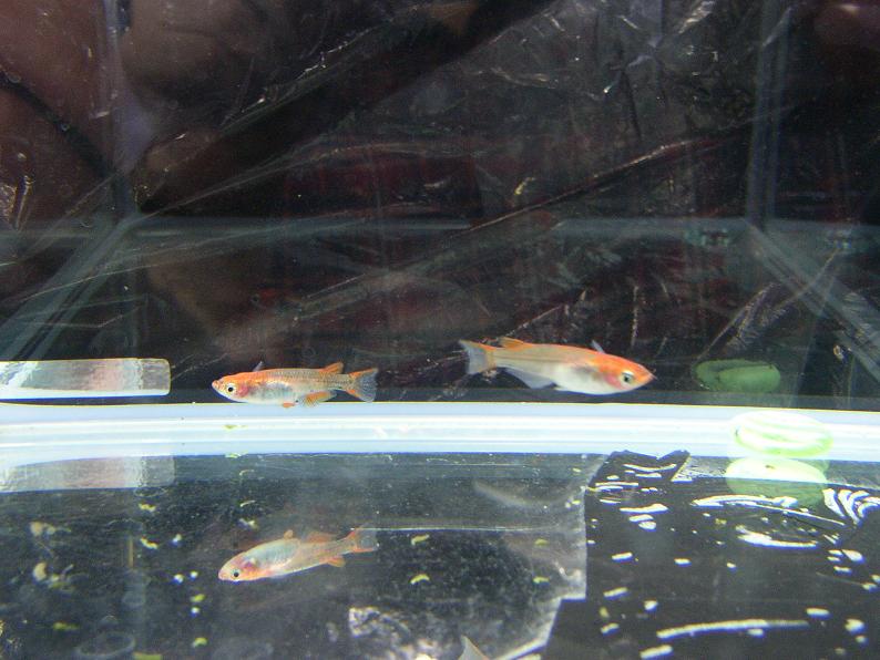 メダカも品評会が。右は『青色透明鱗』という名前で展示されていた。透けた体に青いラインが印象的で、何となく南米産カラシンの仲間を思わせる。頬の赤も相まって可愛らしい。何年か待てば普及するかな?