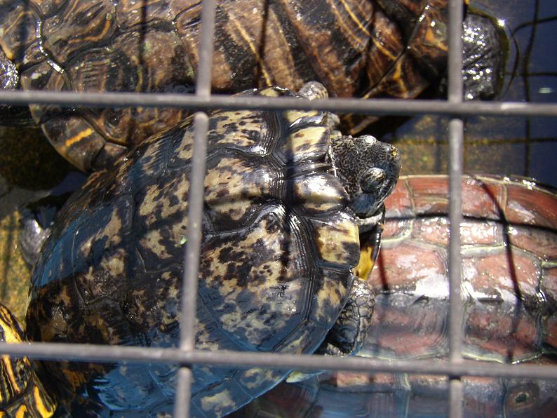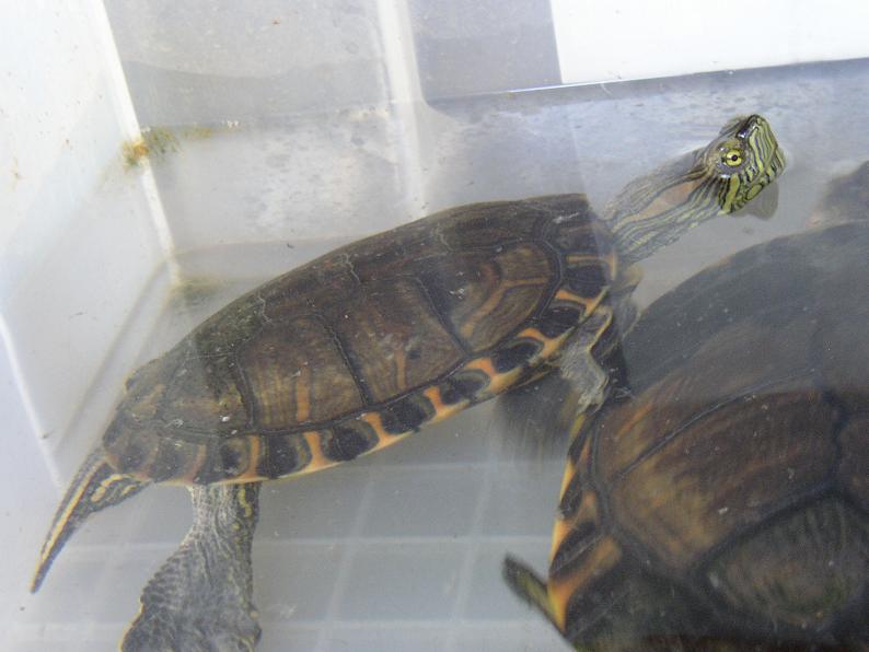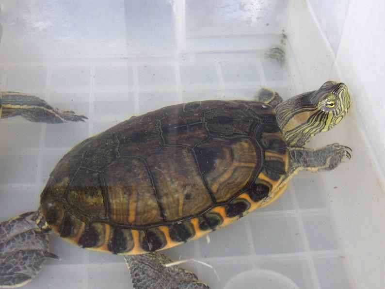 珍しい原産国のワイルドという話だったが、国内に帰化している個体との外見的な差異は、少なくとも私には見つけられない。ただ、同時に輸入されたという個体の中に、リオグランデアカミミを思わせる赤耳模様の崩れた個体が混じっていた。一緒に売られていた数匹を見る限り、特に甲羅の模様が派手という印象は受けなかったが、ひょとしたらリオグランデアカミミの産地に近い個体群なのかもしれない。同時に輸入されたというベビー(複数)が皆、甲羅が一様に茶色いのが印象的だった。もっとも、これは今にして思えばシブが付いてただけ。当時はそれが判らなくて、『すげー、ドミニカスライダーみてー』なんて思ってた。買わなくて良かった。本当に買わなくて良かった。