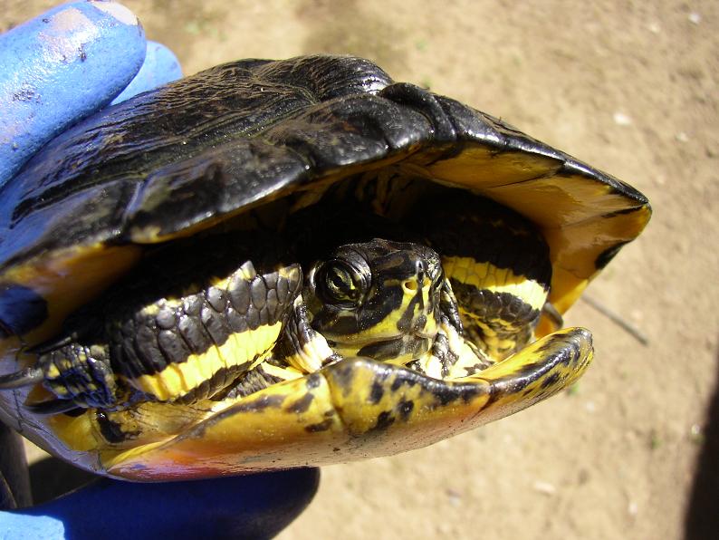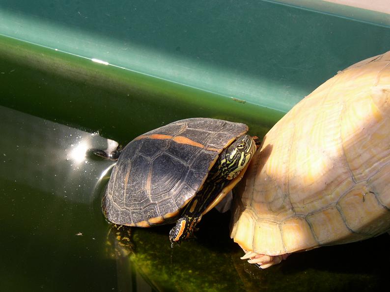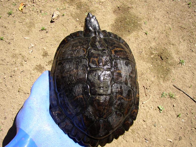 キバラガメのオス。画像だと迫力満点に見えるが、多分甲長は15~16cm程度。昨年辺りから第2~3椎甲板が濁り始めて、最初は脱皮不全かと思ったが、どうやら加齢に伴う色彩変化っぽい。飼育開始以来、盛っているところを1度も見た事がないが、繁殖させても持て余しそうなので良いか。