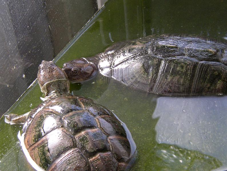 店ではレプトミンスーパーを与えていたそうだが、幸い、我が家に来てからはレプトミンやカメプロスを普通に食べる他、葉野菜も食べてくれている。このサイズでも葉野菜を与えると意外なほど食べるのを初めて知った。”ベビーは肉食傾向が強い”という固定観念に囚われると、却って失敗するのかもしれない。