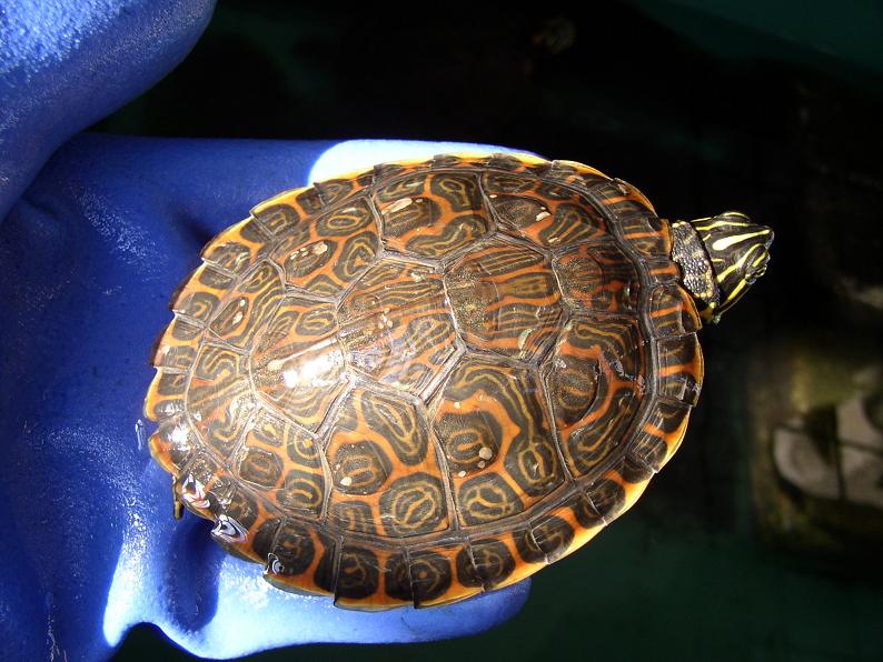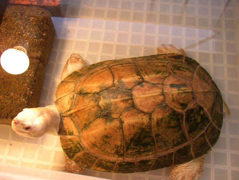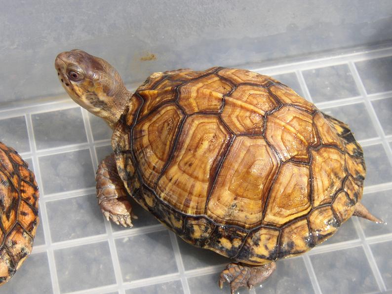 当初、こいつも他の4匹と一緒にしていたが、御覧の通り甲の一部を噛まれてしまったので隔離。こいつは以前に単独飼育にもかかわらず謎の肌荒れを起こしたり(http://blueorange.sugo-roku.com/Entry/150/)、一昨年は真冬でも土に潜らないので加温飼育に切り替えたり、妙に弱い印象がある。単独飼育している分には普通に元気なのだが・・・。この地味さでは繁殖に積極的に使う気にもなれないし、ペットと割り切って飼って行くしかなさそう。