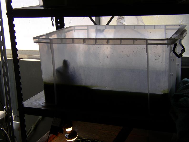 相変わらず室内のこの環境で飼育中。窓際で陽当たりは比較的良好な位置の為、体温上昇には役立っているだろう。電気を一切使用しないのが売りの飼育スタイルだが、少なくとも体温調節が出来る手段はあってこその結果という訳で、先述の言葉を第三者に都合良く受け取られるのは私としては不本意。まだ動きが鈍い為か、上陸しているところを初めて撮影出来た(不調でなければ良いんだが・・・)。