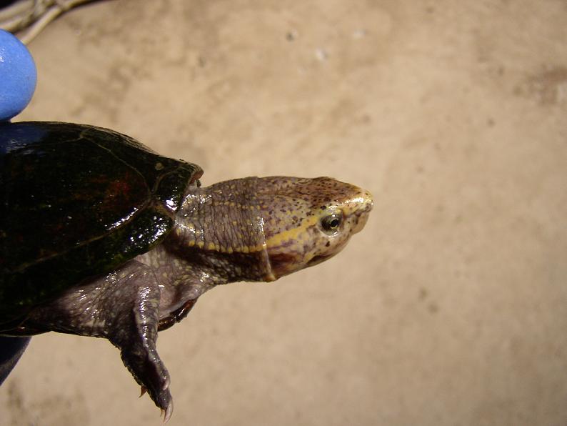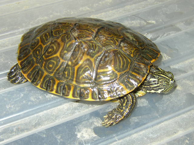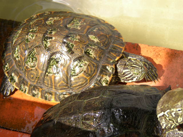 2003年撮影。記憶の上では、確か2002年に飼い始めた。テネシーと明らかに異なる、背甲が黒く濁って斑紋が目立たない、6cm程度に育った若い個体が、単に『リバークーター』として売られていた。買って育ててみたところ、カロライナらしさ溢れる個体になった。
